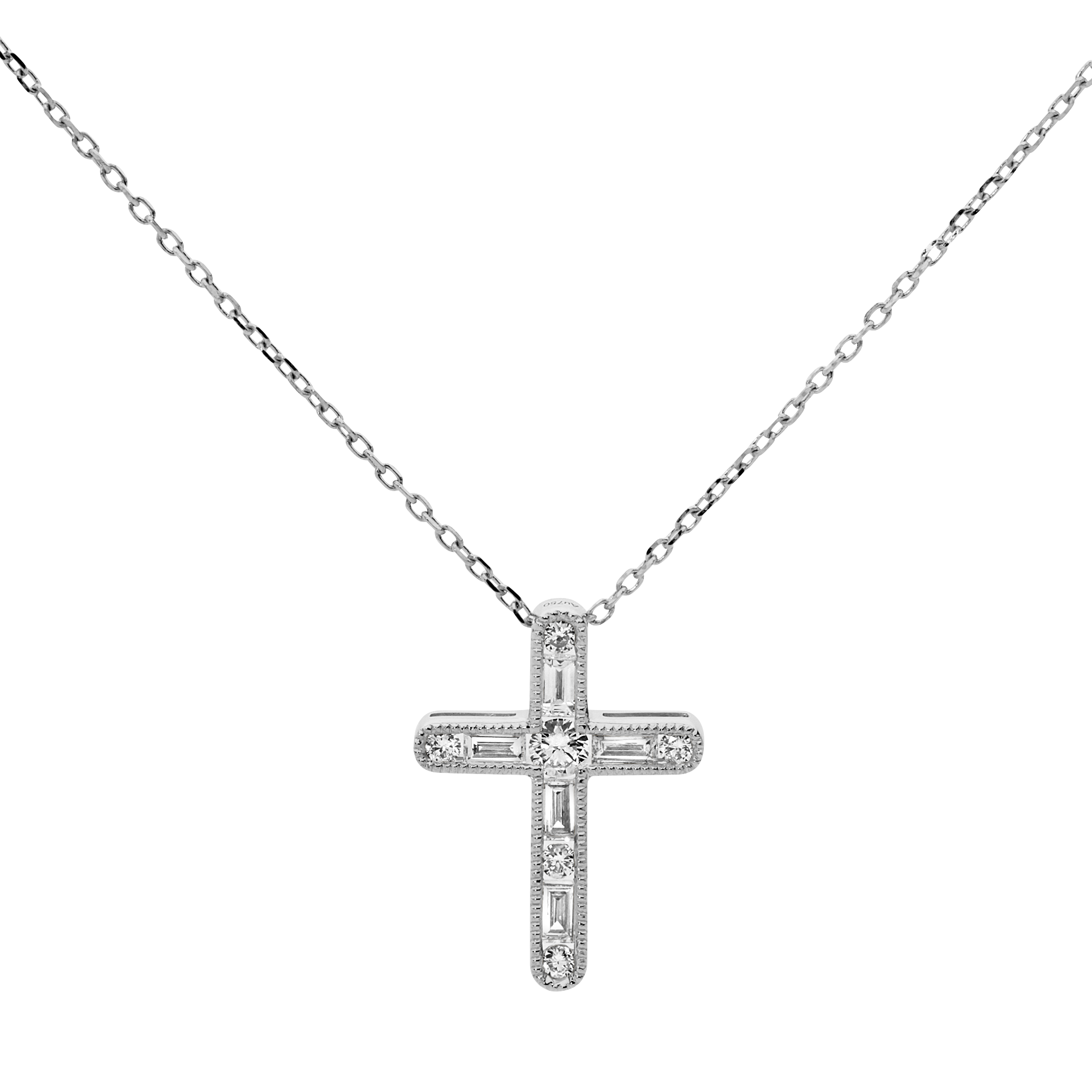 Perfectly crafted in K'DOR's Atelier - This beautiful diamond cross is part of our Faith Collection. Created with 5 channel set baguette-cut natural diamonds and 6 channel set brilliant-cut natural diamonds sit in a delicate milgrain bevel. With a total diamond weight of 0.31 carats and paired with our K'DOR signature adjustable 18k gold chain. Available in yellow gold, white gold or rose gold.
