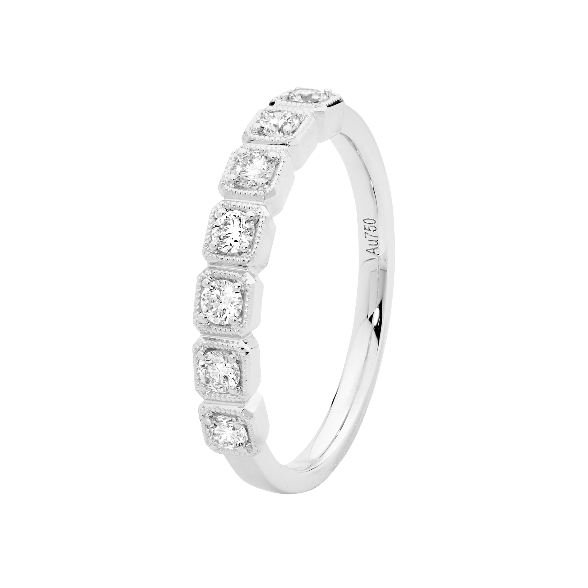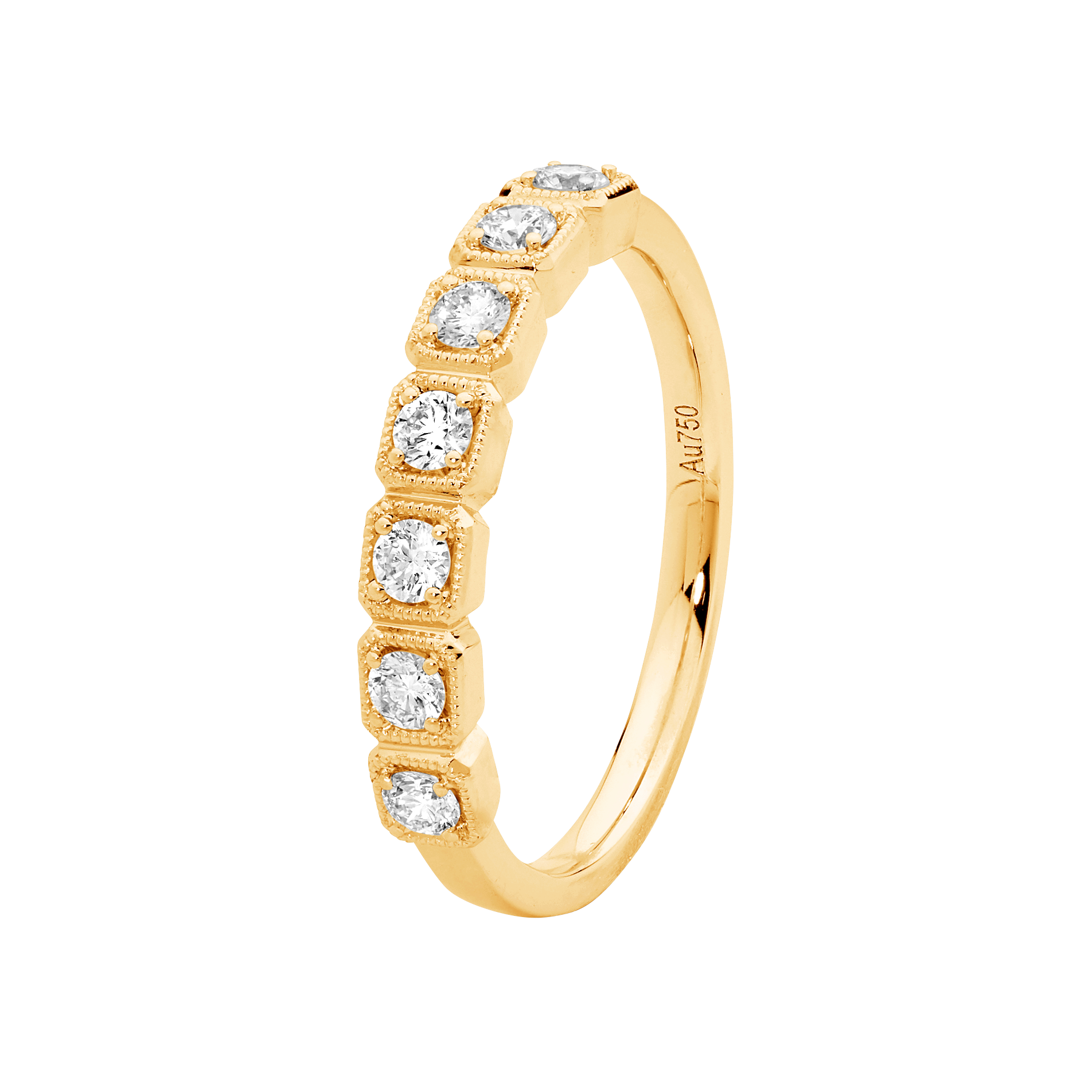 An exquisitely handcrafted ladies diamond band, set in 18ct gold. Showcasing seven brilliant-cut natural diamonds framed with a delicate milgrain bezel totalling weight of 0.34 carats, each stone boasts exceptional F in colour and VS in clarity, offering timeless sparkle and sophistication.