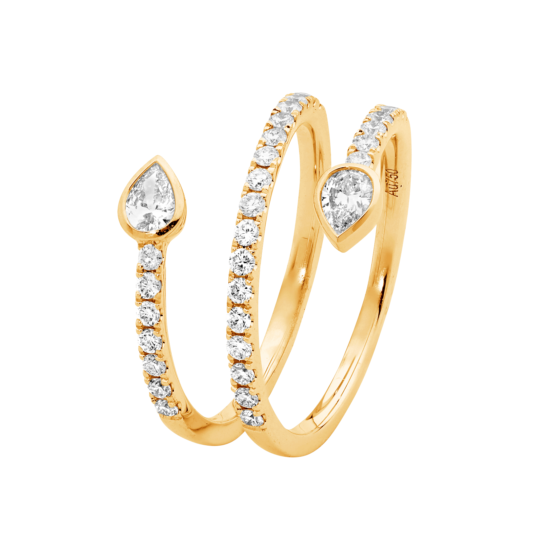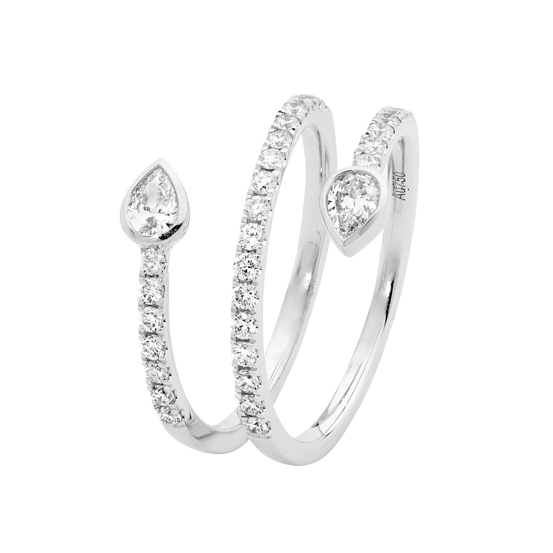 This sophisticated design showcases two bezel-set pear-shaped diamonds totalling 0.27 carats, gracefully framed by 31 diamonds with a combined weight of 0.40 carats. Each diamond sparkles with exceptional F in colour and VS in clarity, creating a radiant harmony of brilliance and elevation.