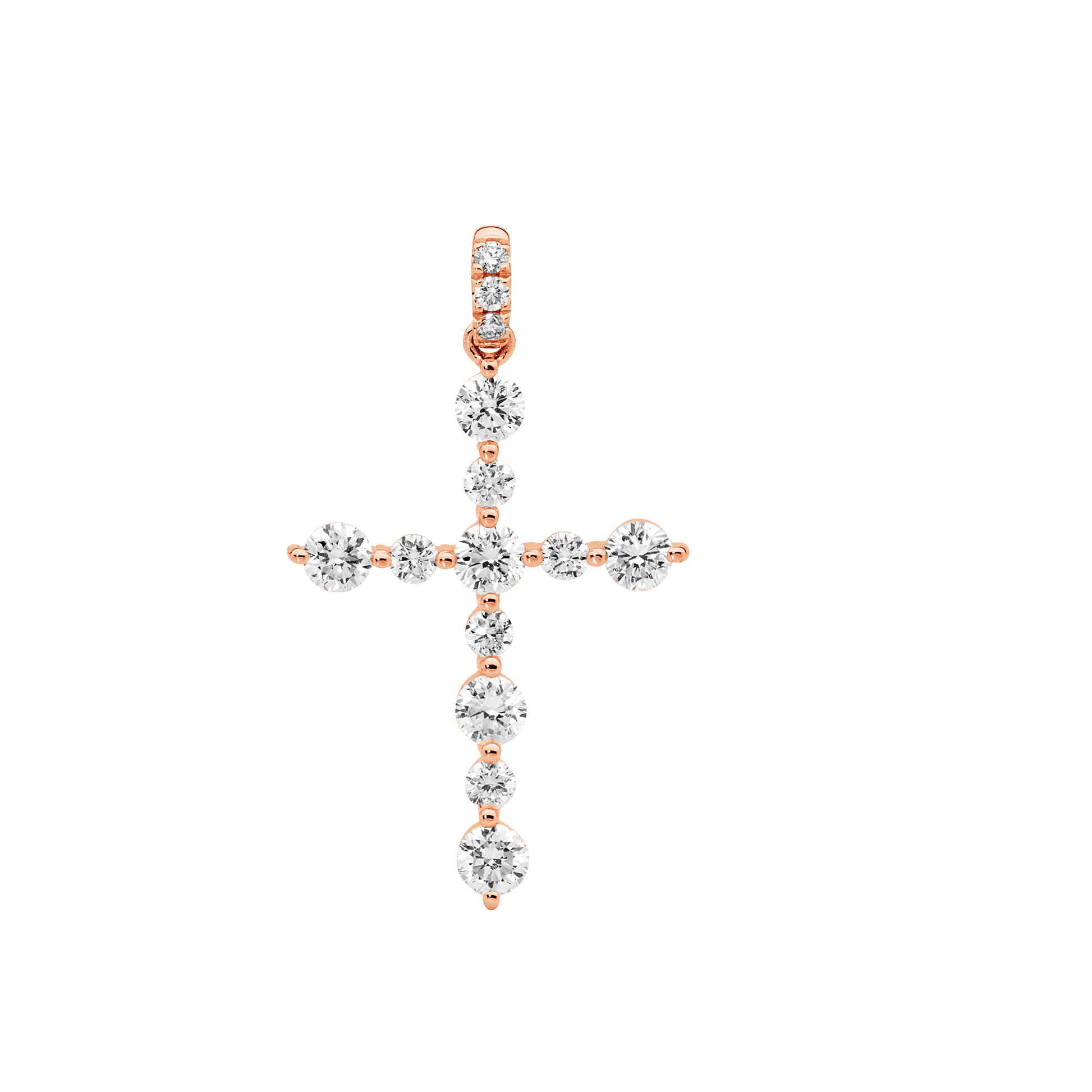 This stunning addition to our Faith Collection was meticulously created with 14 brilliant-cut tension set natural diamonds that alternate in size. With an exquisite claw set diamond bail this cross an be paired perfectly with our signature adjustable K'DOR 18k gold chain.