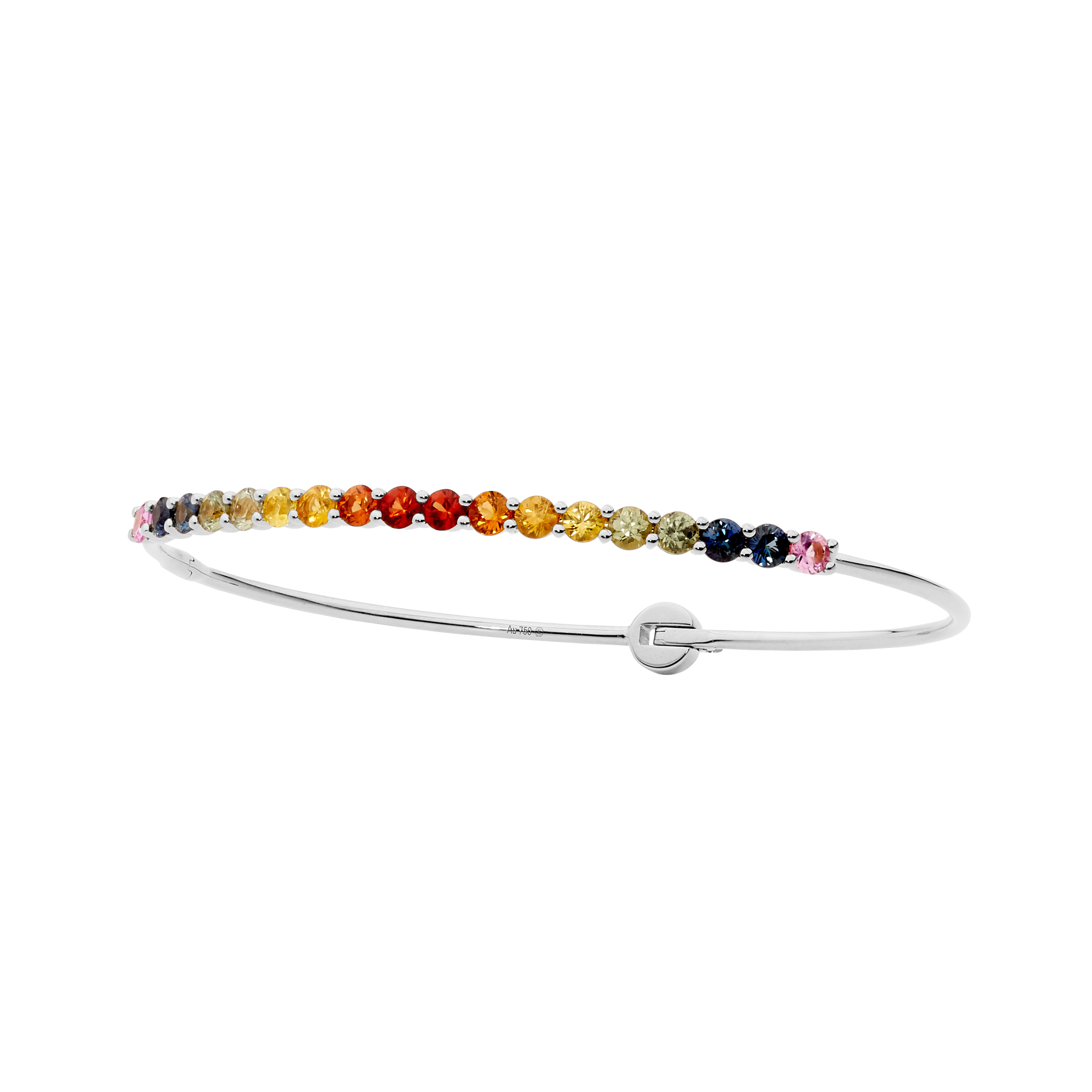 Channel summer elegance all year round with this refined 18K solid gold and sapphire bangle. Showcasing 2.49 carats of 18 coloured brilliant-cut sapphires in rainbow-hued blue, green, pink, yellow and orange tones resting on a delicate band with secure sleek disc clasp.