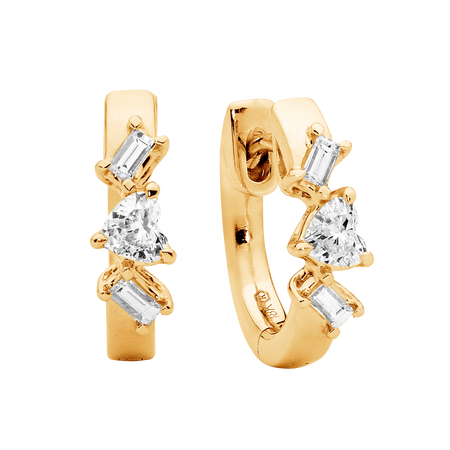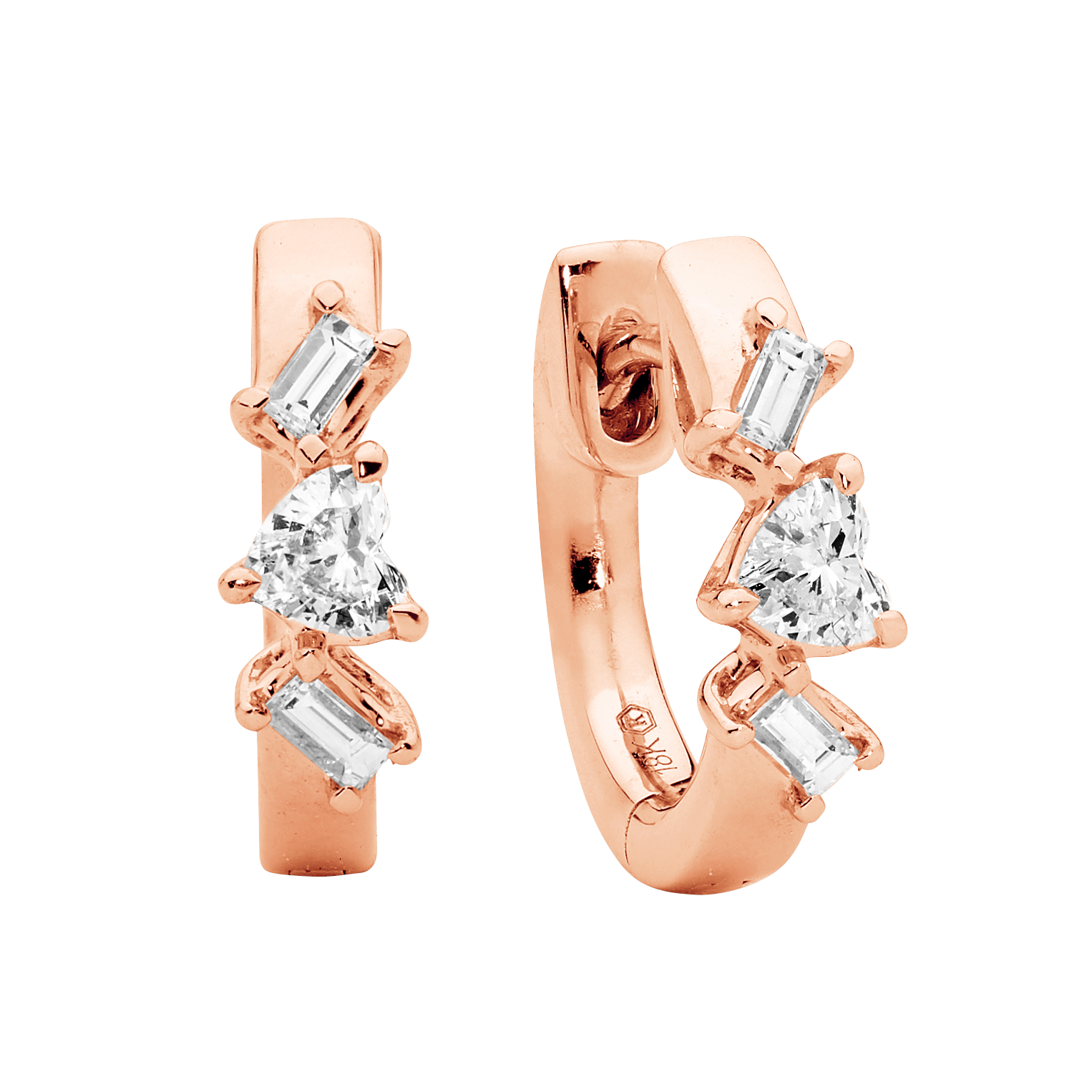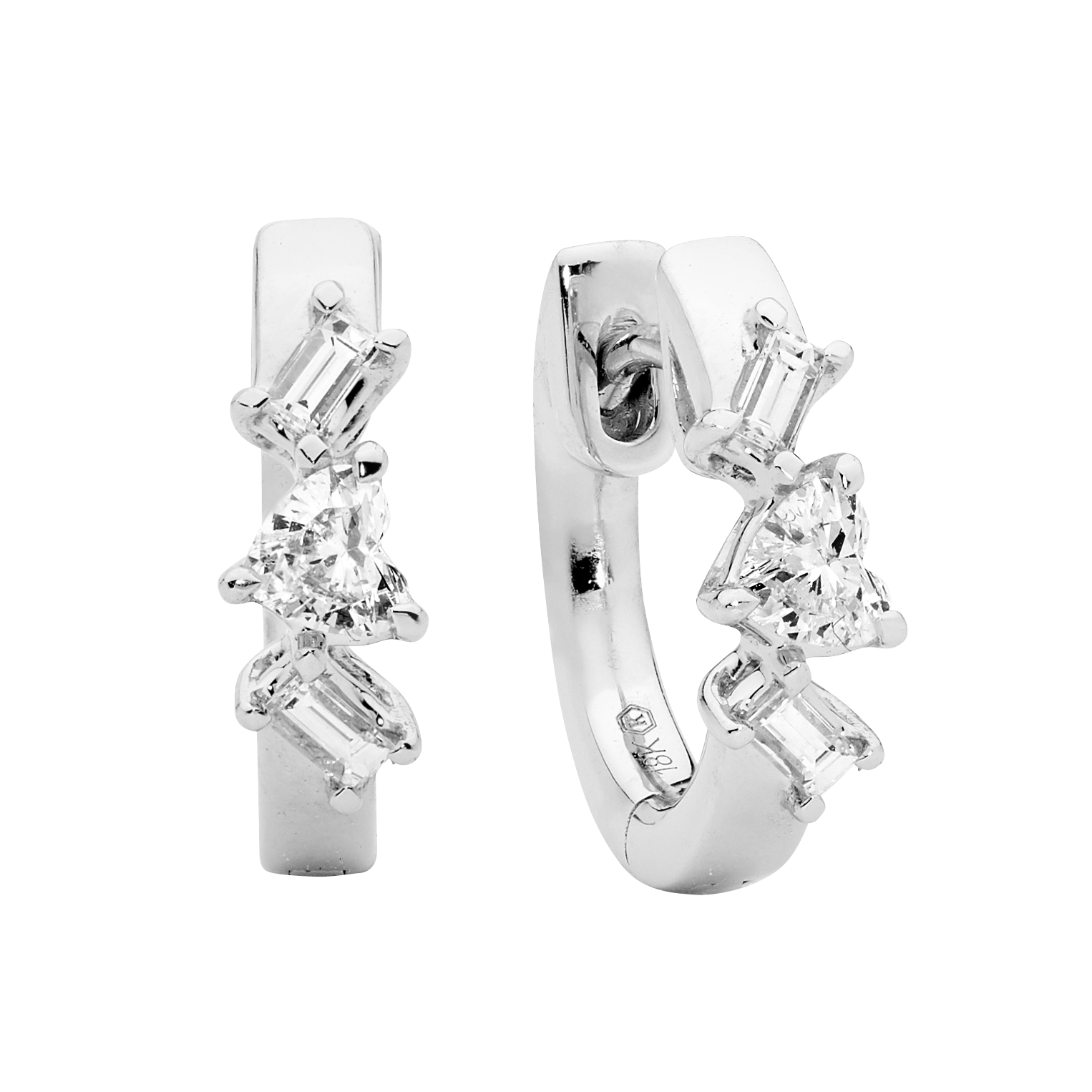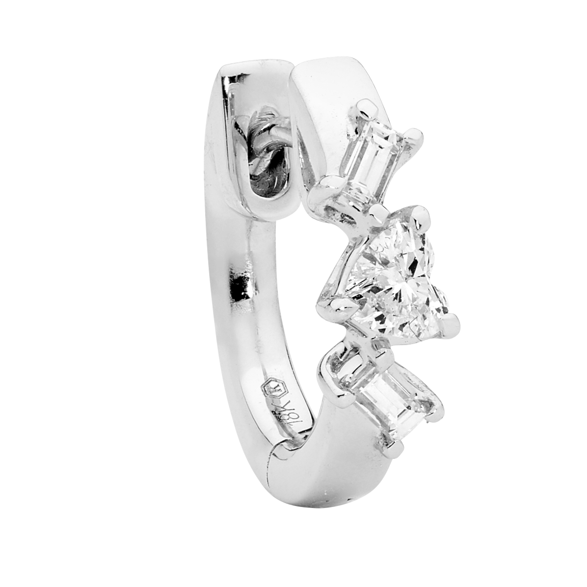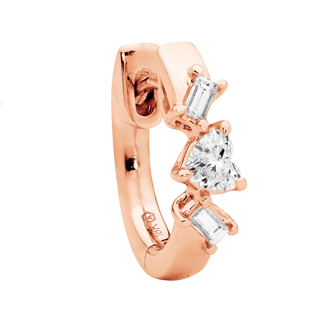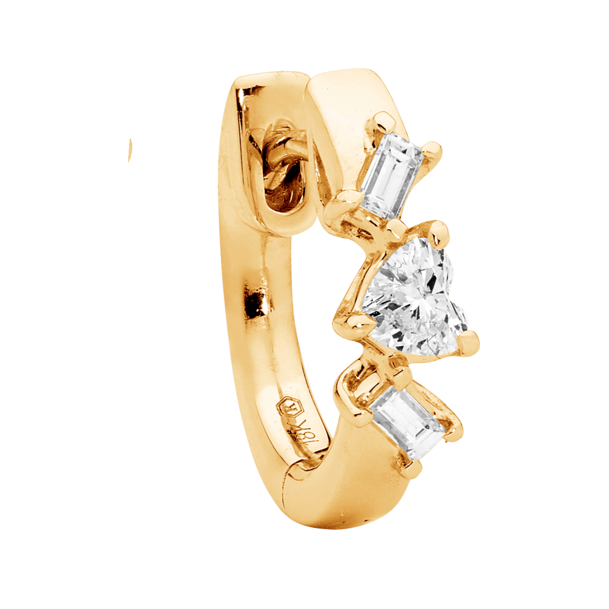Indulge in timeless sophistication with this stunning pair of handcrafted ladies natural diamond hoop earrings, expertly set in radiant 18ct gold. Each earring showcases a Claw-set heart shaped diamond and 2 baguette-cut diamonds - precision cut for a romantic yet sleek and modern look. Can be purchased as a single or pair in yellow gold, white gold or rose gold.